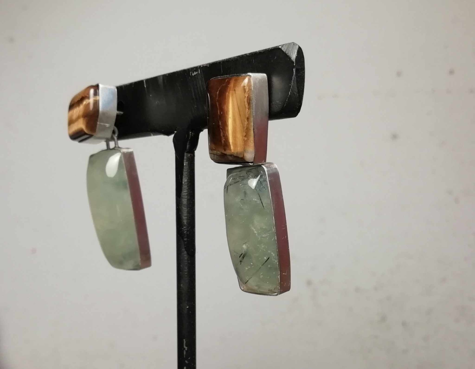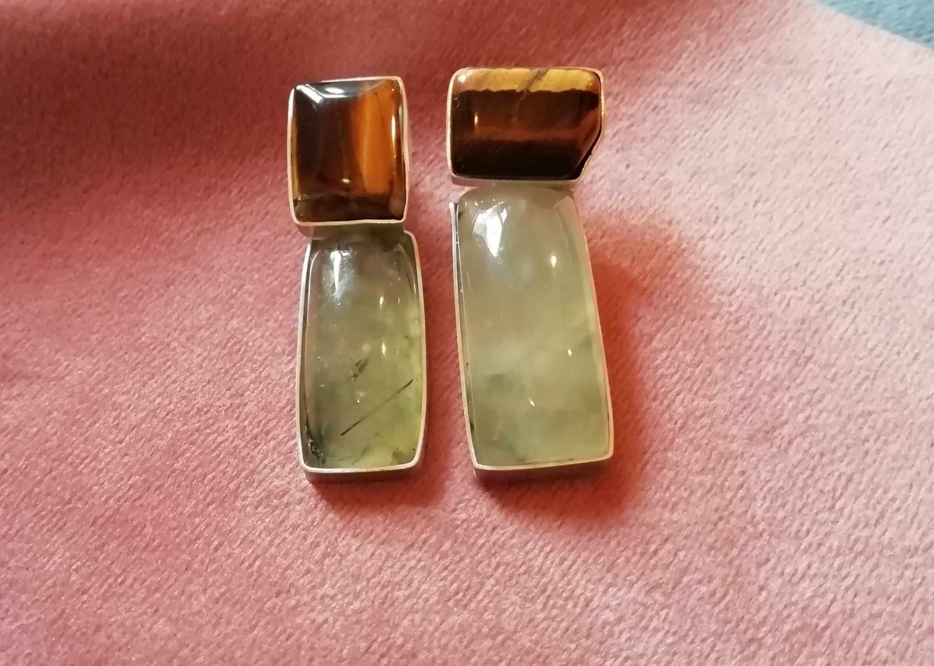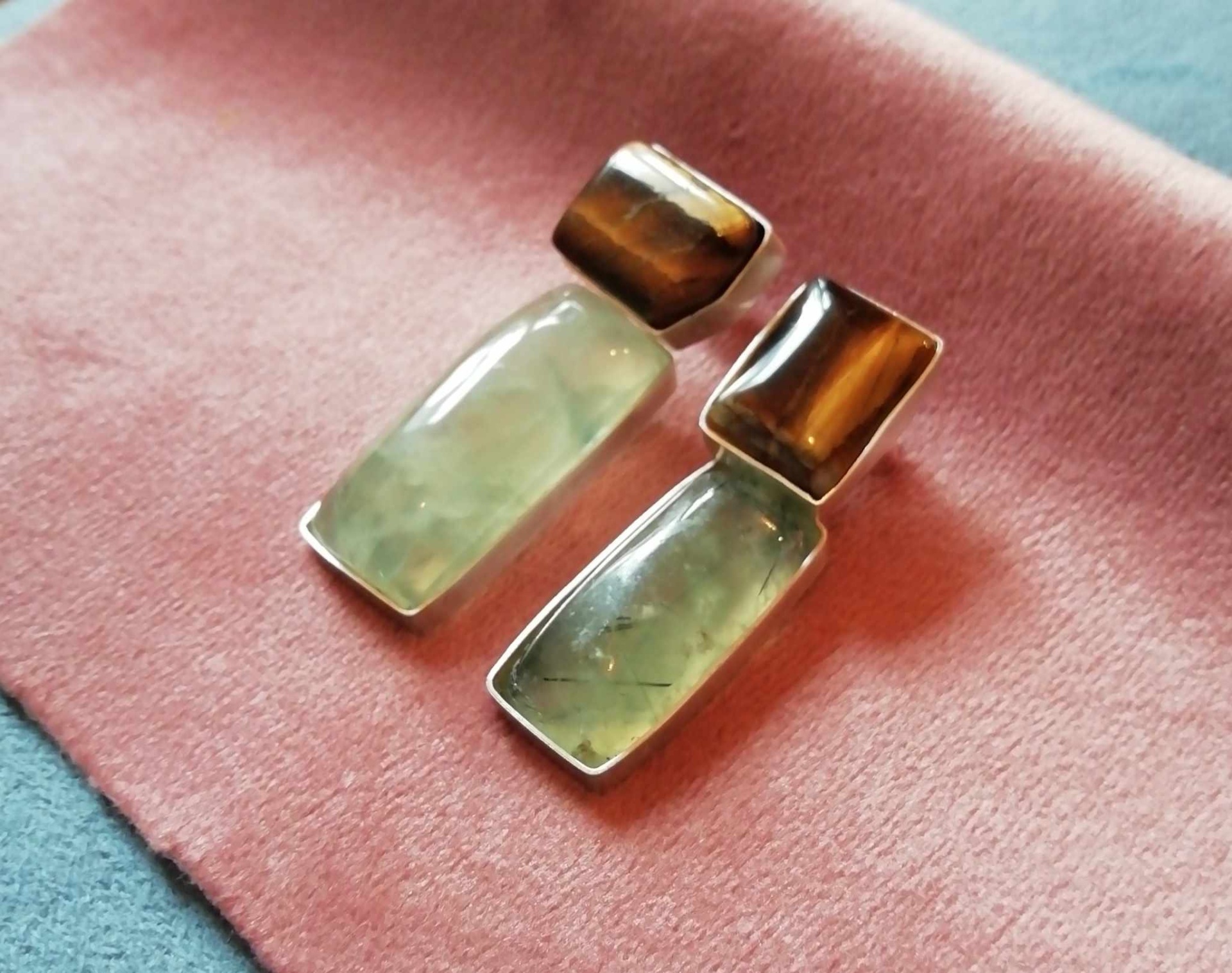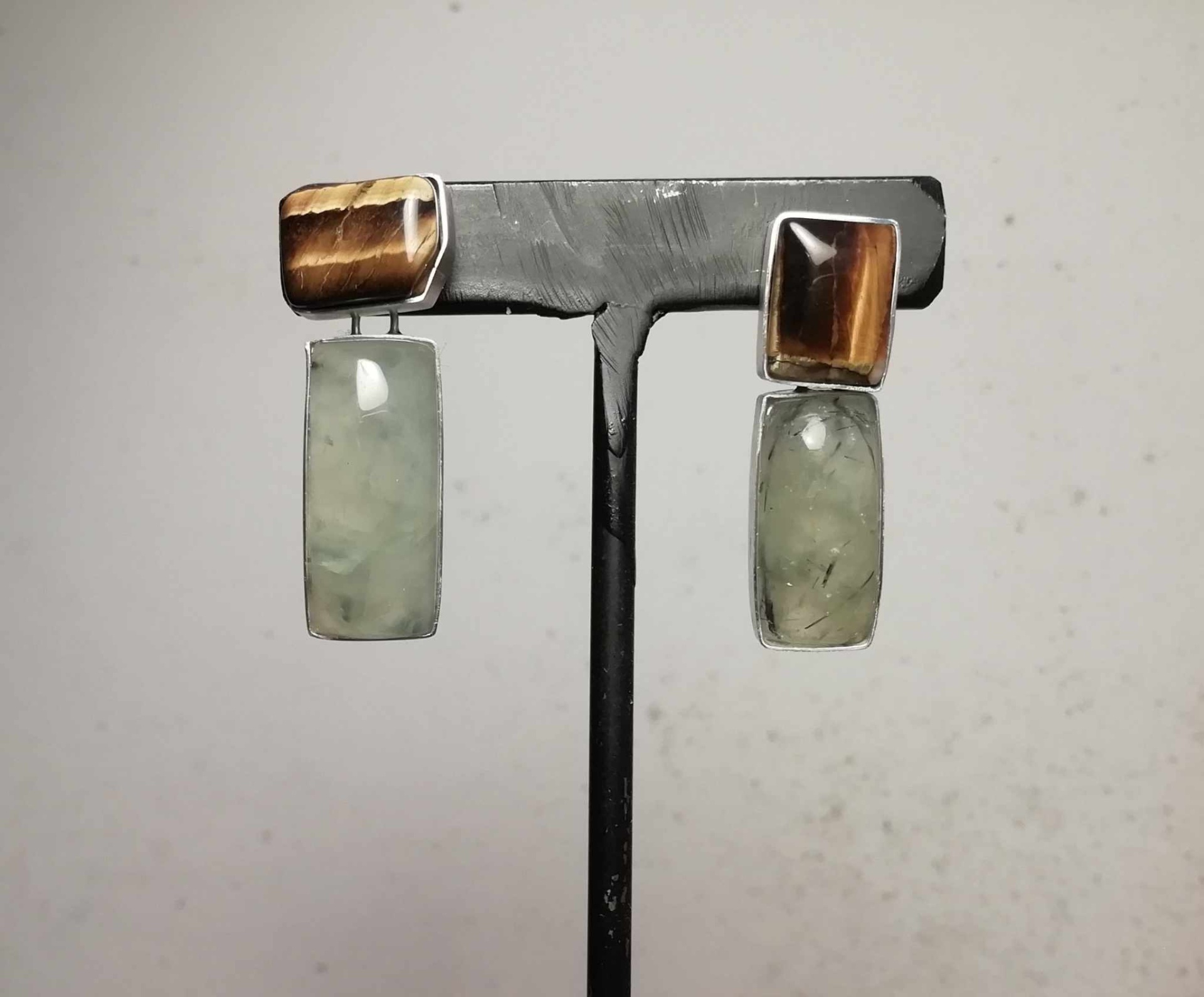 Brincos Prehnite e Olho Tigre 68,00 € Desconto de %. Partilhar O produto encontra-se sem stock. Brincos em prata de lei com Prehnite forma retangular e Olho de Tigre Aconselhamos a manter os brincos em embalagem fechada quando não usados Comprimento : 4cm Peso p/brinco: 10,3gr/7,5gr