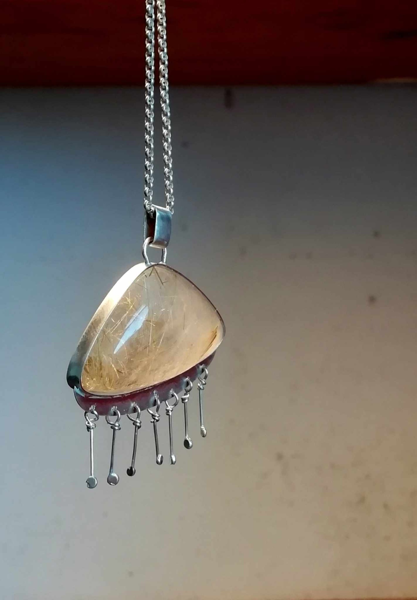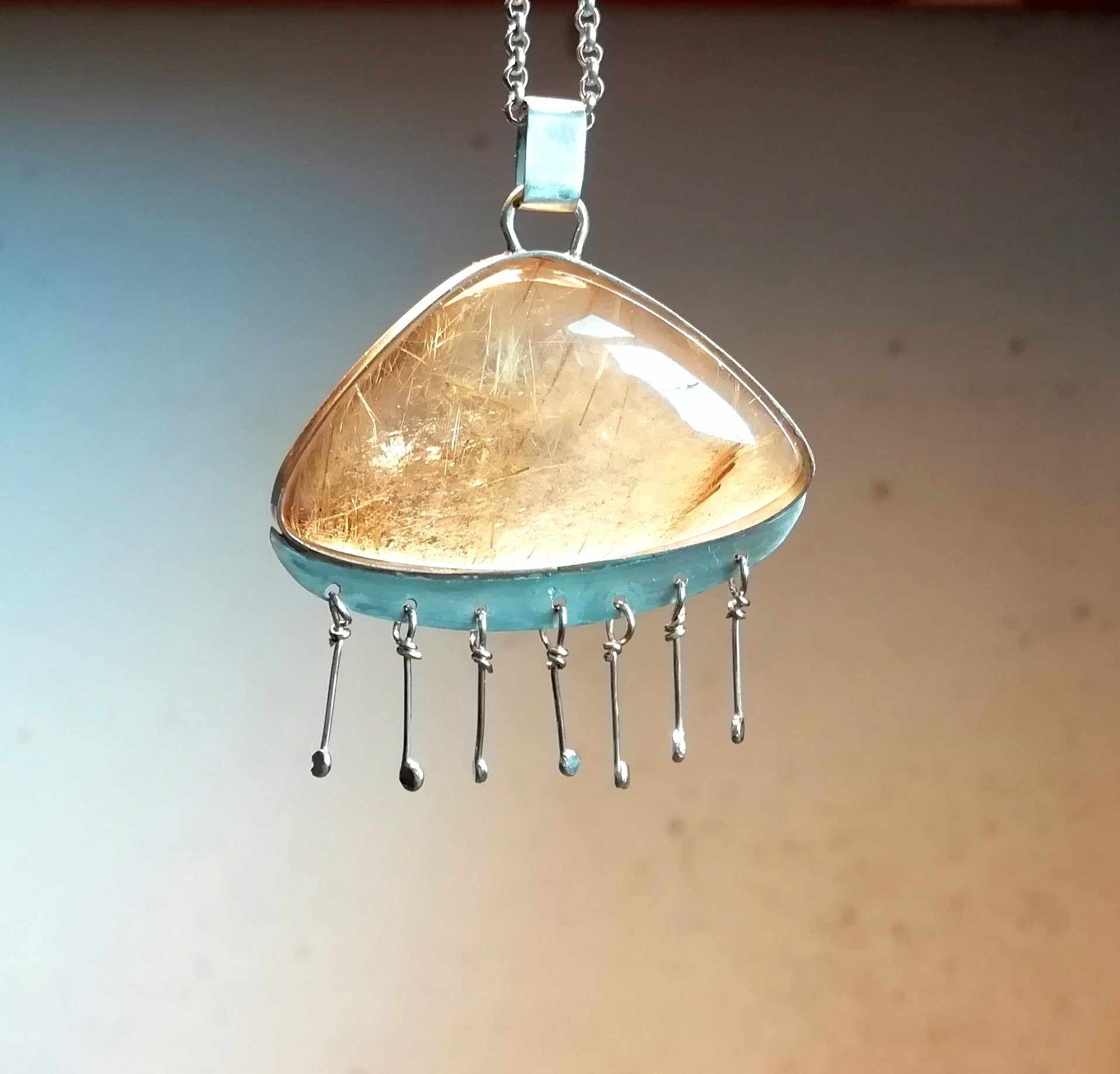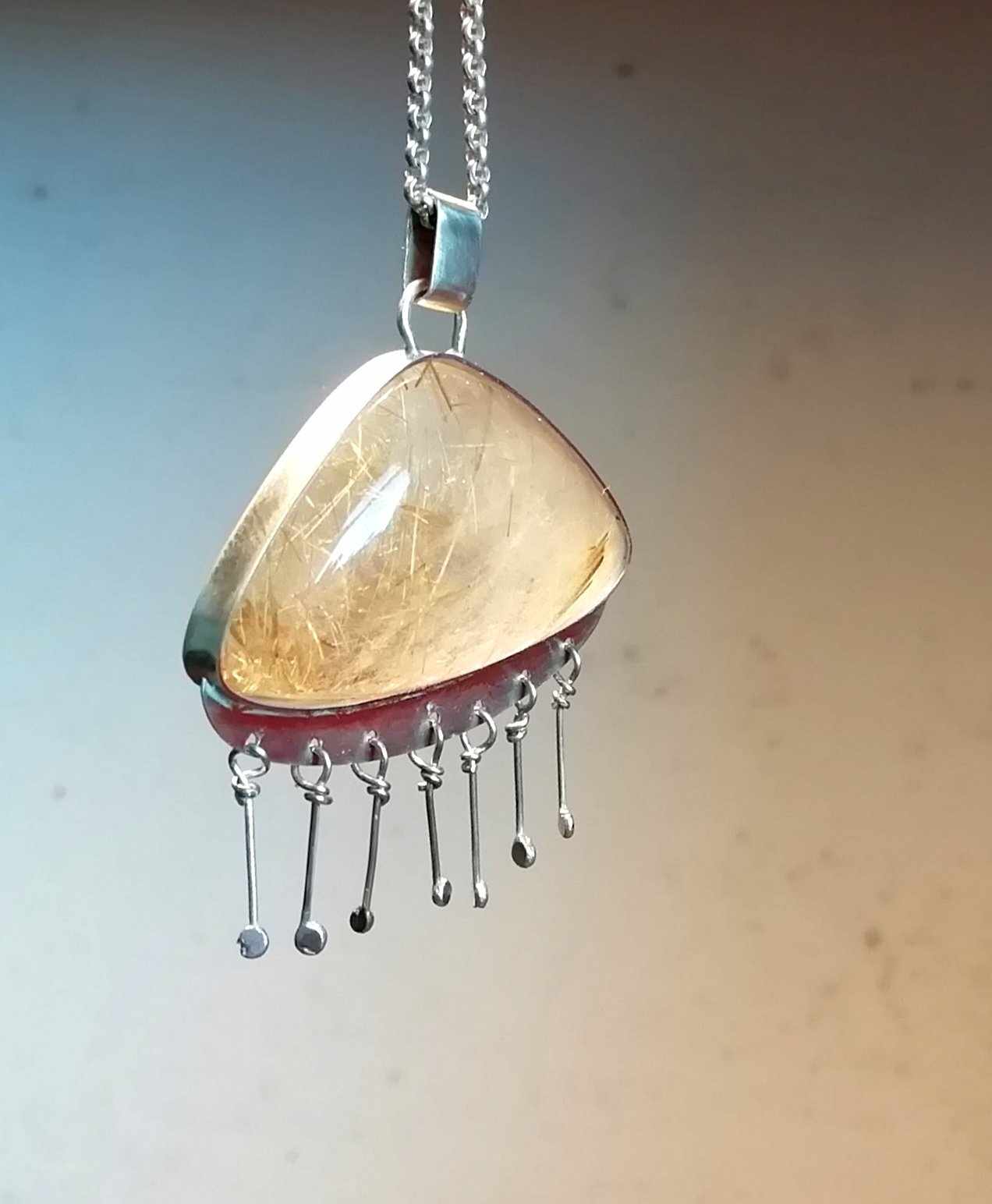 Cordão com pendente Quartzo Rutilado Chuva 95,00 € Desconto de %. Partilhar Comprar Contactar 1 unidades em stock | SKU: CLPD09 Cordão em prata de lei Pendente em prata com Quartzo rutilado Aconselhamos a manter em embalagem fechada quando não usado Cordão: 5,7gr - 70cm Pendente: 10,4gr - Alt 4cm, Larg 3,5cm Peso pedra do pendente: 8,5gr Peso prata do pendente:1,9gr